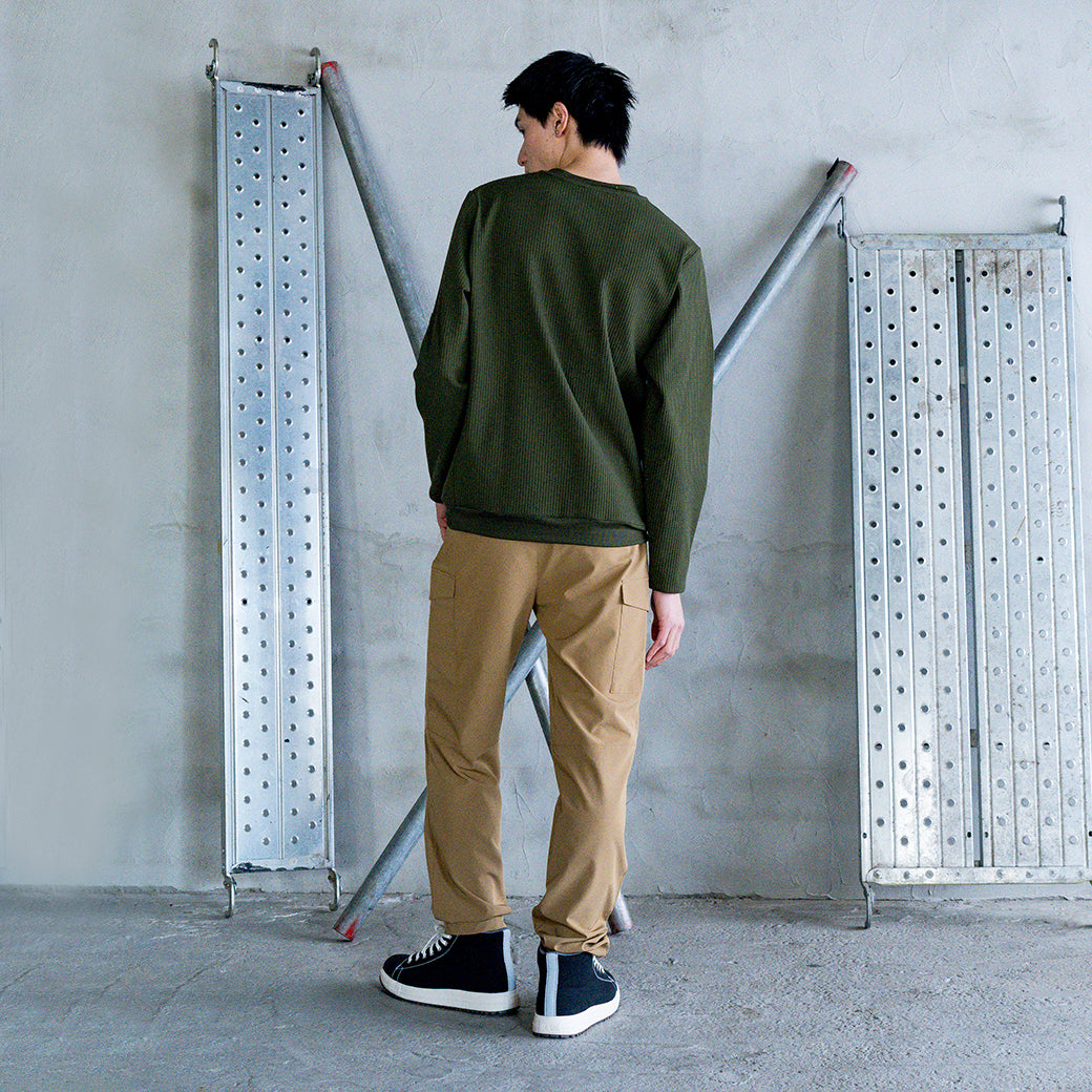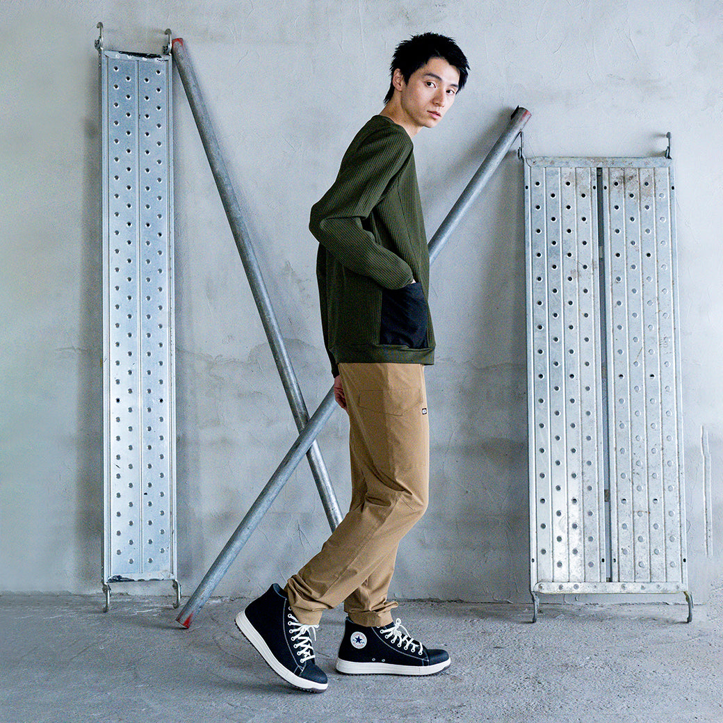厚みのあるワッフル生地で、しっかりとした着心地ながら、しなやかなストレッチ性で動きやすさもバッチリ。作業中でも活躍する高収納ポケットに加え、ワークウエアとしての機能性も充実。さらに、オフの日にも着やすいデザインなので、仕事終わりにも最適。